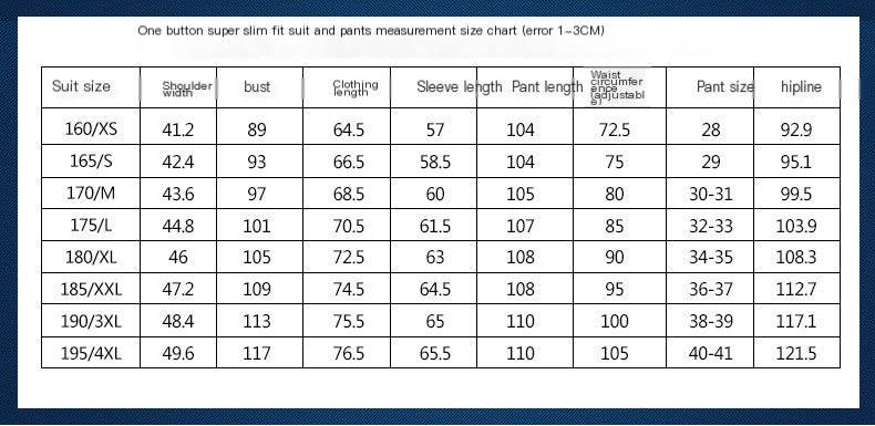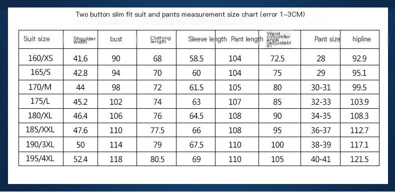 Expertly constructed from premium blended serge fabric that offers exceptional breathability, natural temperature regulation, and professional-grade comfort while maintaining the suit's structured appearance and sophisticated silhouette throughout extended wear periods and demanding professional schedules. The slim-fit design is precisely engineered to enhance your physique while ensuring comfortable movement, confident posturing, and natural mobility during active professional engagement, social interaction, and important formal events that require sustained elegant presentation. Available in comprehensive sizing from XS through 4XL, each size maintains the intended sophisticated proportions while ensuring proper fit through shoulders, chest, waist, and inseam measurements for diverse body types and professional styling needs. The superior fabric composition and quality construction ensure this suit maintains its shape, professional appearance, and elegant characteristics through countless important occasions while providing the comfort and confidence needed for peak performance in any situation that demands your absolute best.