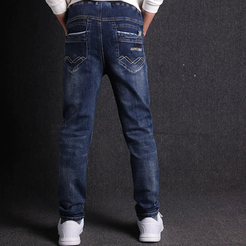 Crafted from high-quality cotton that features micro stretch fabric providing flexibility and ease of movement, these jeans ensure your little one stays comfortable all day long whether it's playtime at the park or casual outings. Available in sleek blue color that can easily be paired with variety of tops for versatile styling options, these jeans combine style, comfort, and practicality for upgrading your child's wardrobe with clothing designed to maintain shape and comfort wash after wash.