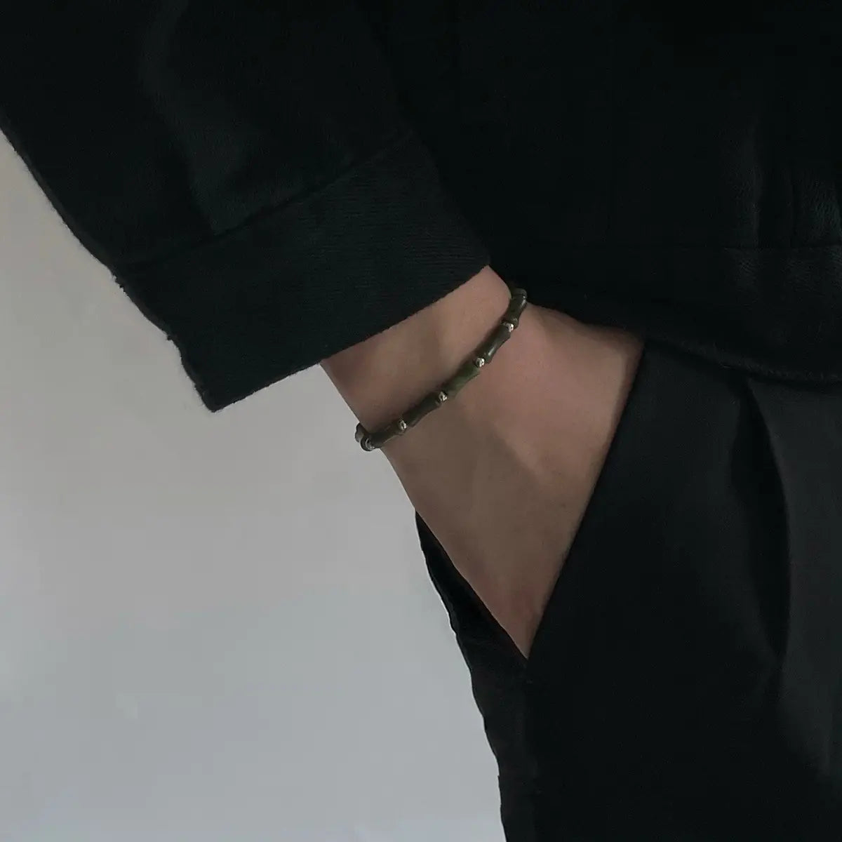 This distinguished bracelet showcases the beautiful natural variations of jade combined with the sleek sophistication of titanium steel, creating a piece that celebrates both organic beauty and modern craftsmanship. The unique bamboo beaded pattern and irregular geometric elements ensure that each bracelet has its own distinctive character while maintaining the sophisticated appeal that defines quality masculine accessories.