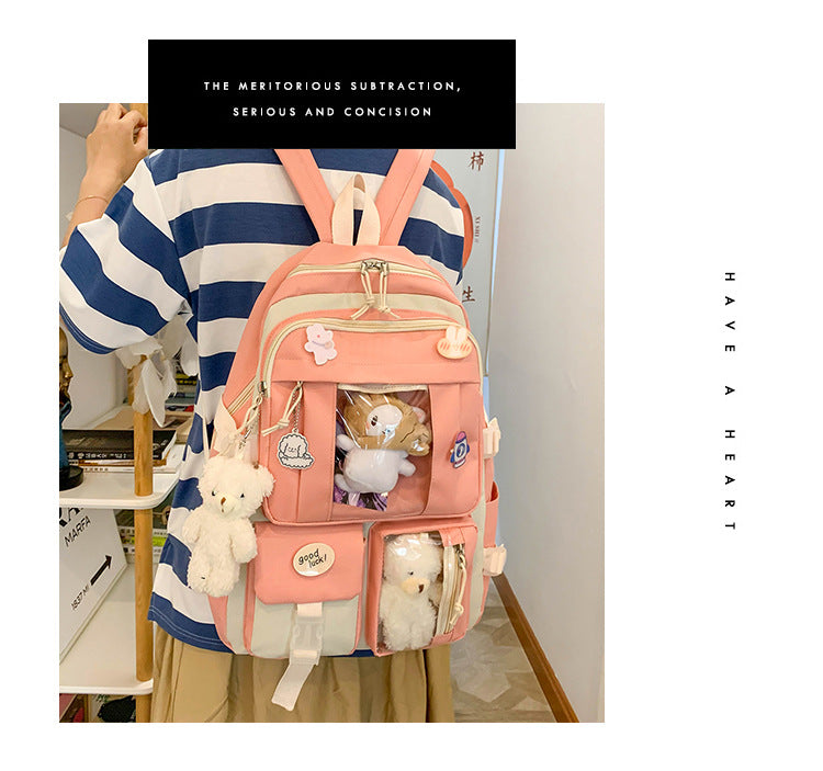 Our Kawaii School Companion features premium nylon construction with adorable bear plush design in fresh and sweet style aesthetic with spacious interior design and ultra-lightweight construction (0.68kg) as a complete five-piece set available in five vibrant colors. Embrace academic kawaii with this exceptional backpack set that proves school functionality and adorable charm create the perfect partnership for middle school fashionistas who deserve both practical organization and delightful personal expression in their daily academic adventures.